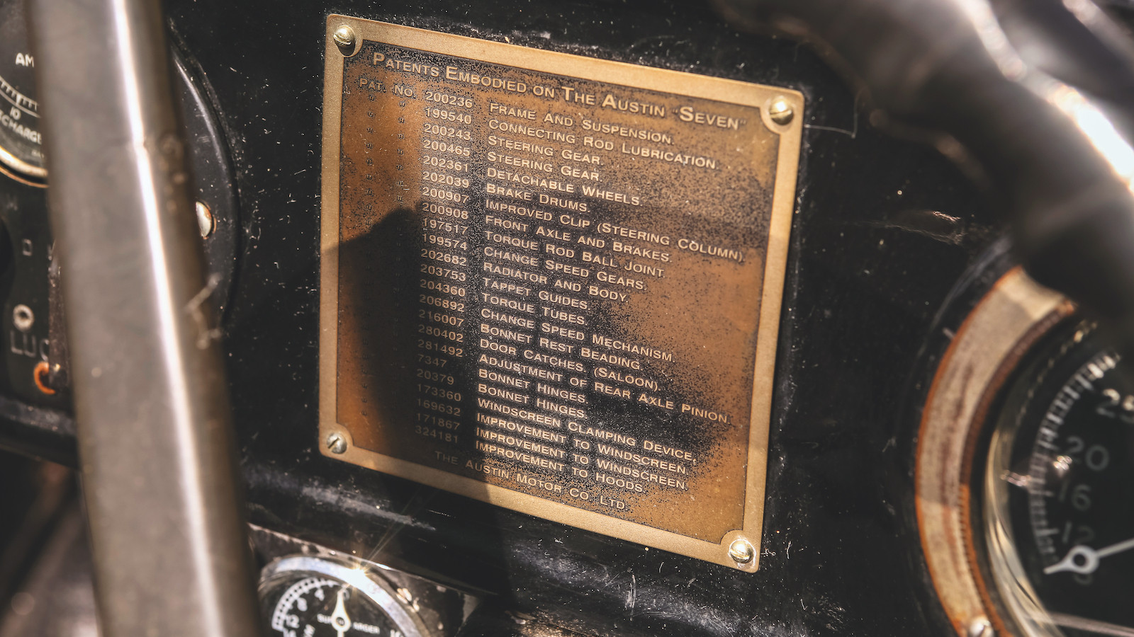 The car featured a number of features that Austin then patented, and these were listed on a plate on each car’s dashboard.