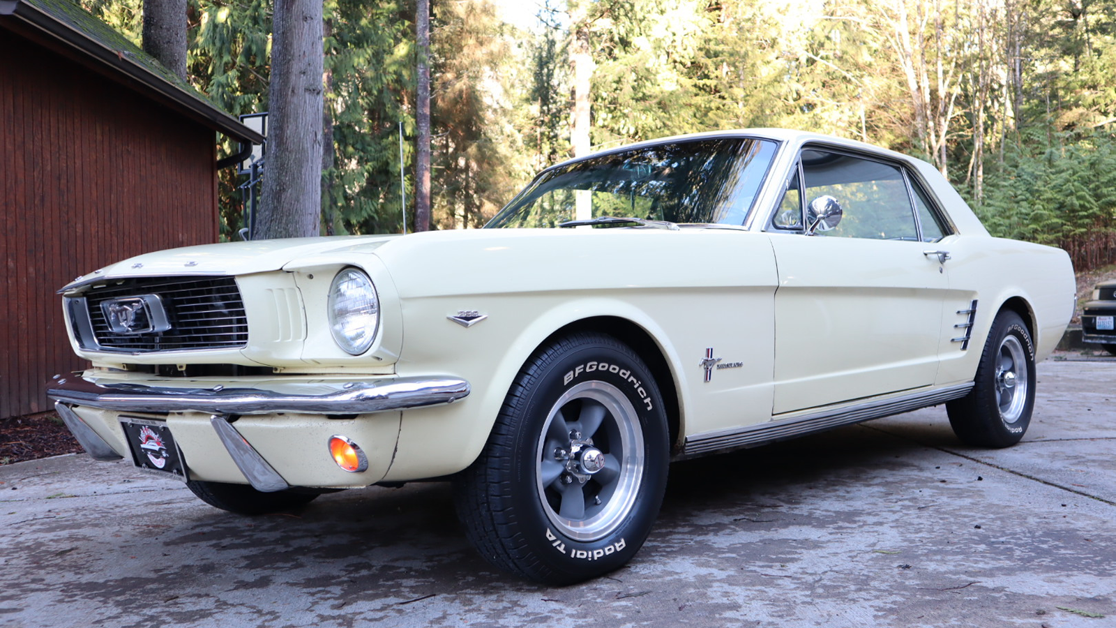 Or how about this Springtime Yellow over black vinyl ’66 Mustang notchback?
