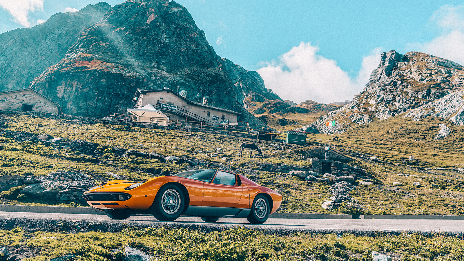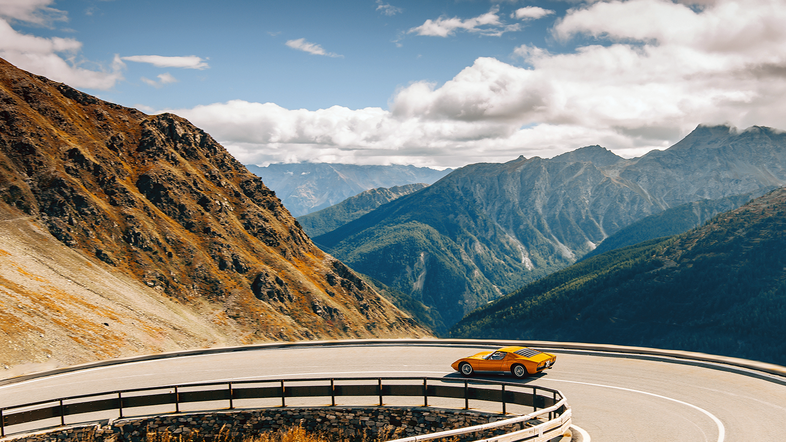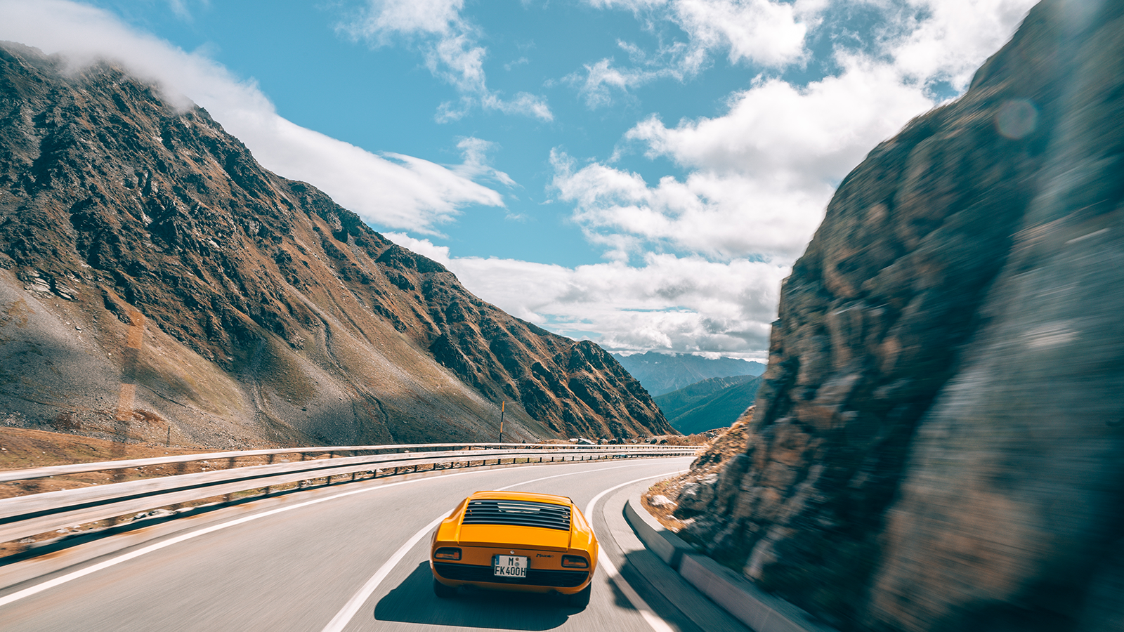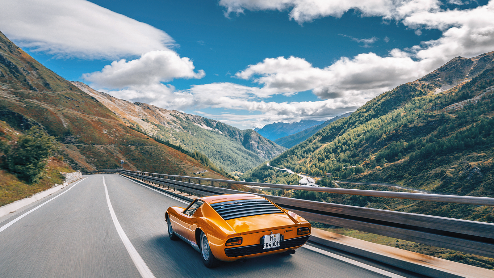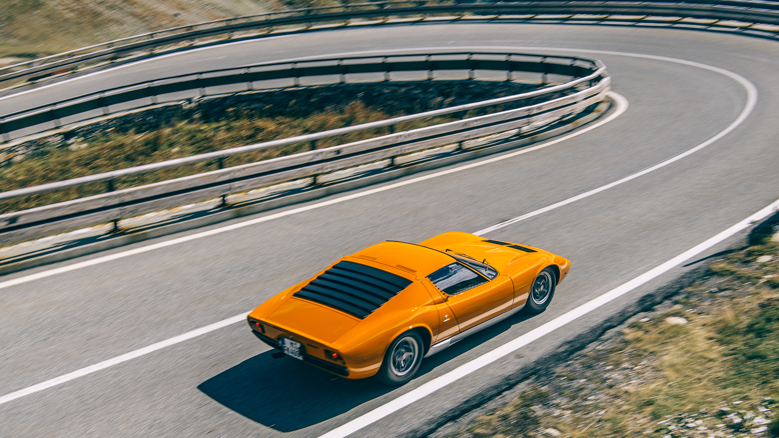 We’ve just covered the 305m of the Dardanelli Viaduct in a flash of orange rage and are already negotiating the first hairpin bends of the Colle de Gran San Bernardo in a Rosso Miura Lamborghini.