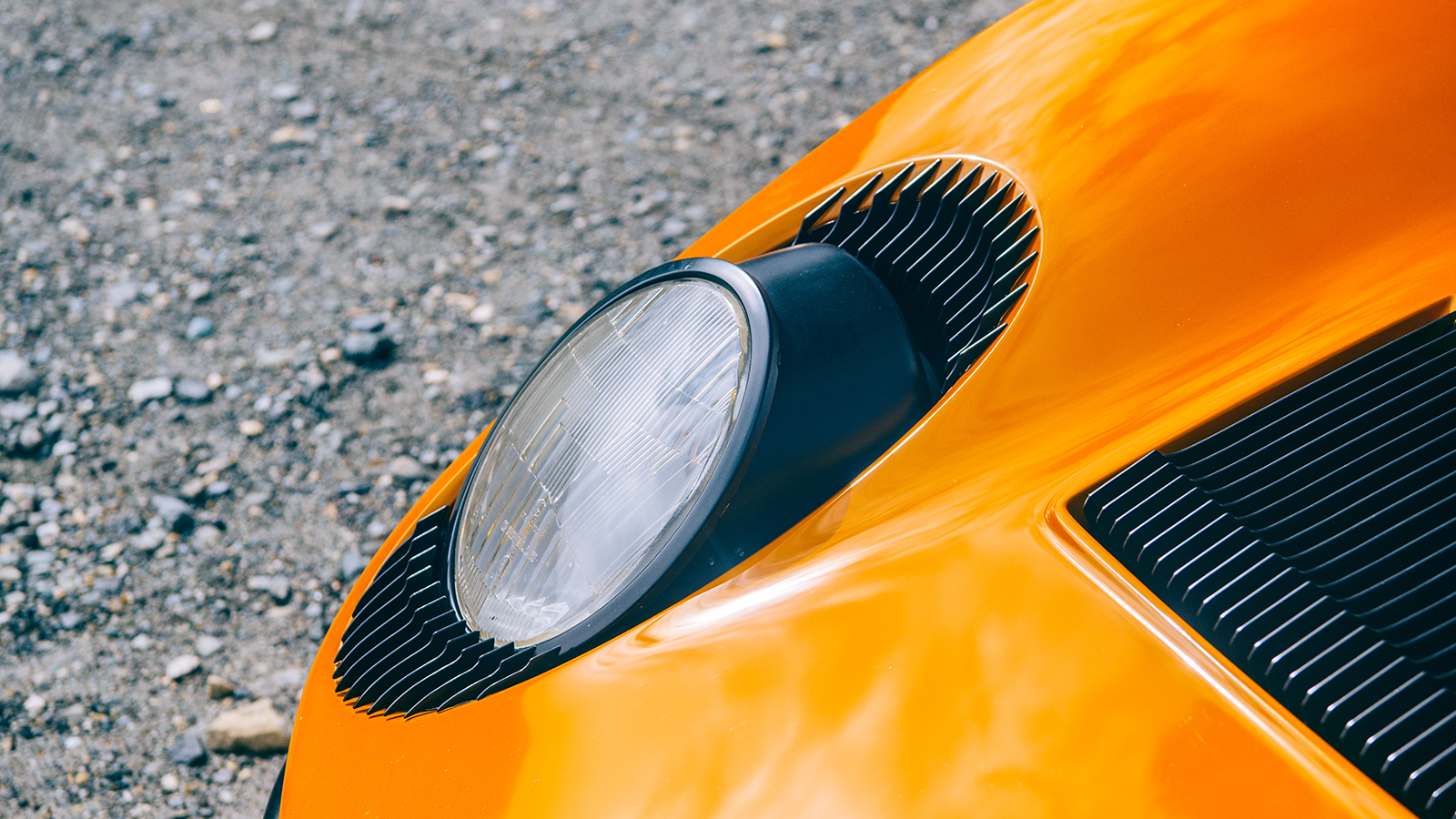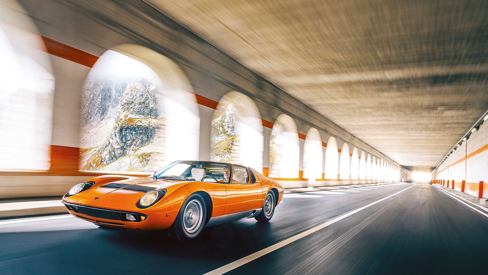 As the black mouth of a tunnel approaches, Moruzzi scrabbles for the bank of switches in the roof, flicking on the Miura’s headlights.