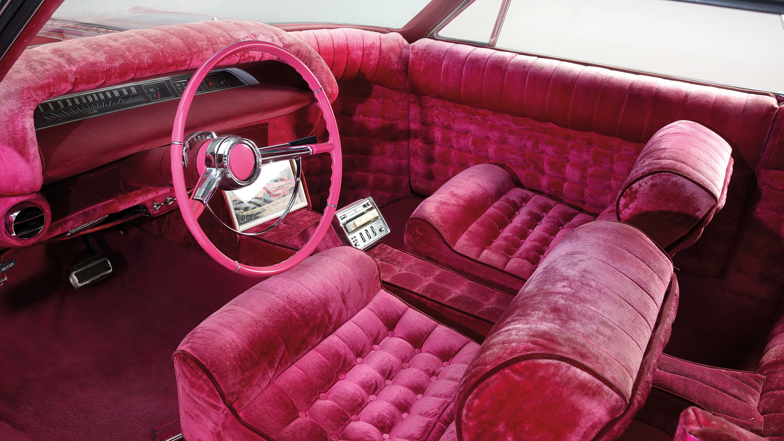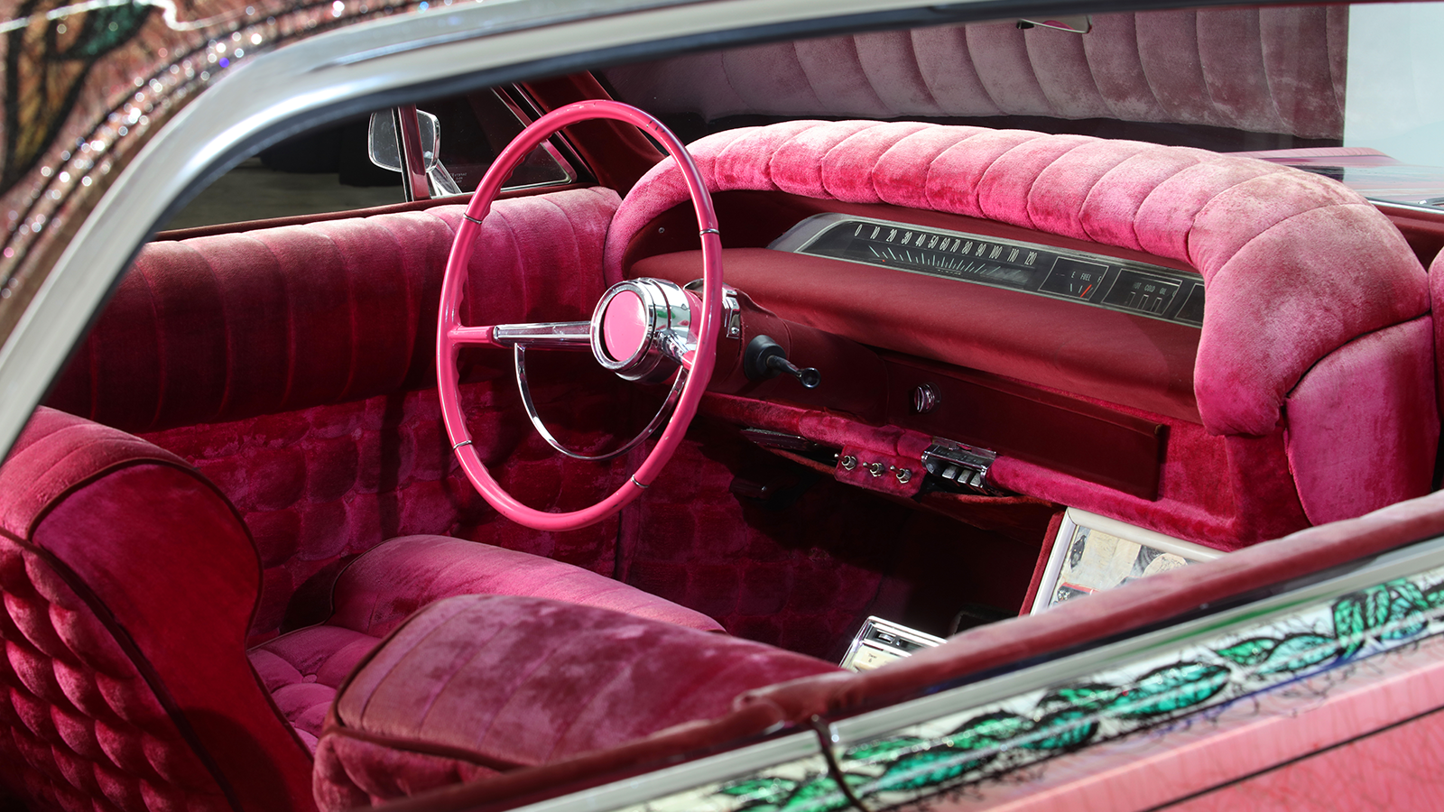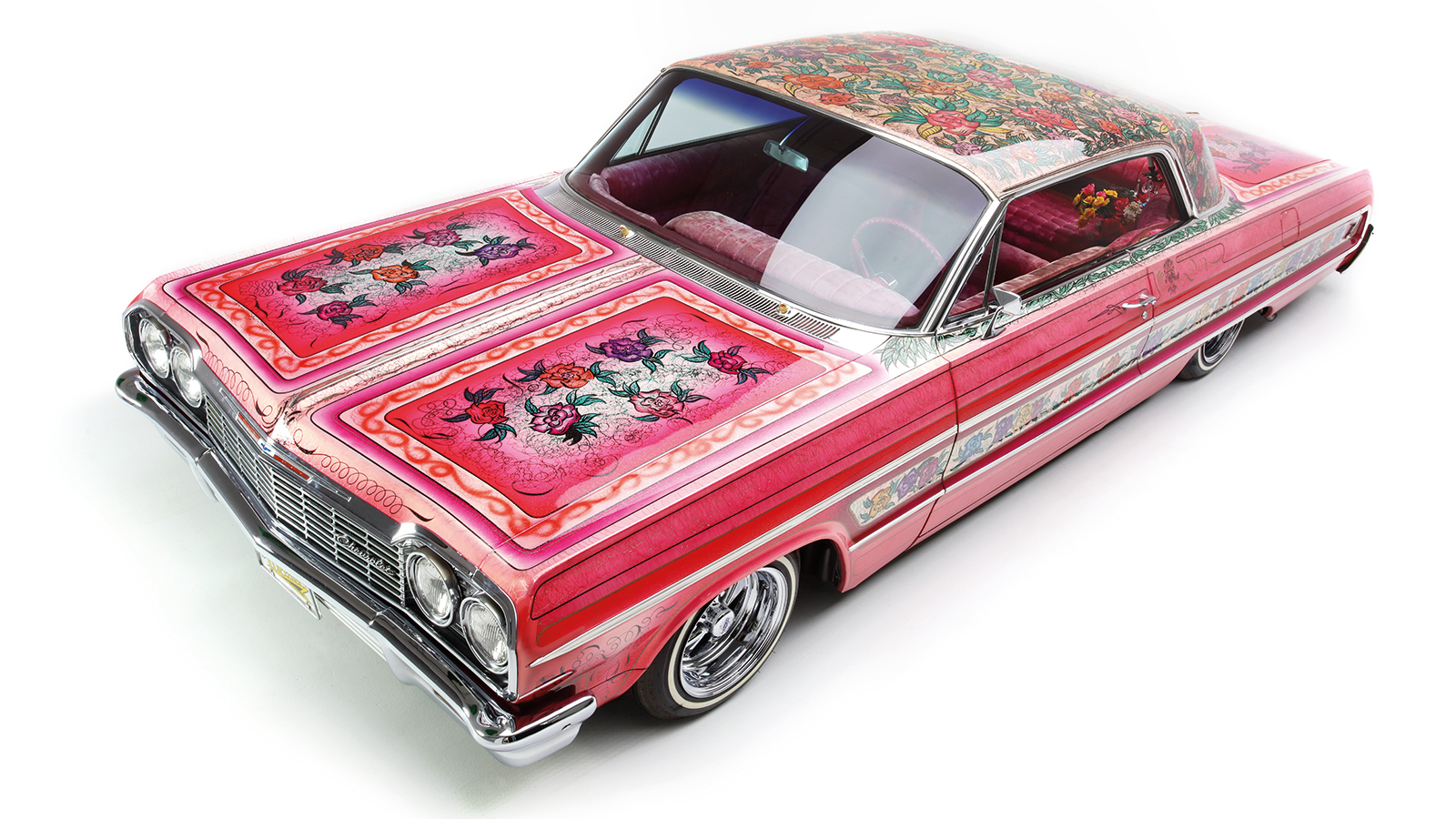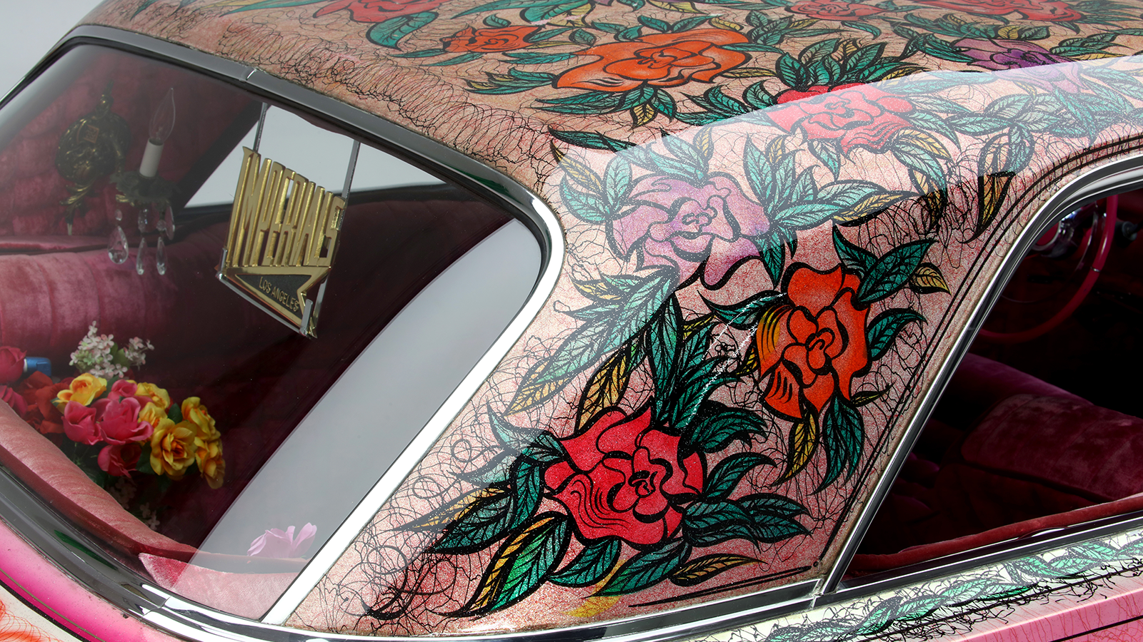 Most striking of all was the roof: dozens of immaculate roses against a pink metalflake background. The entire car was drowned in clearcoat – as much as 20 gallons, according to legend.