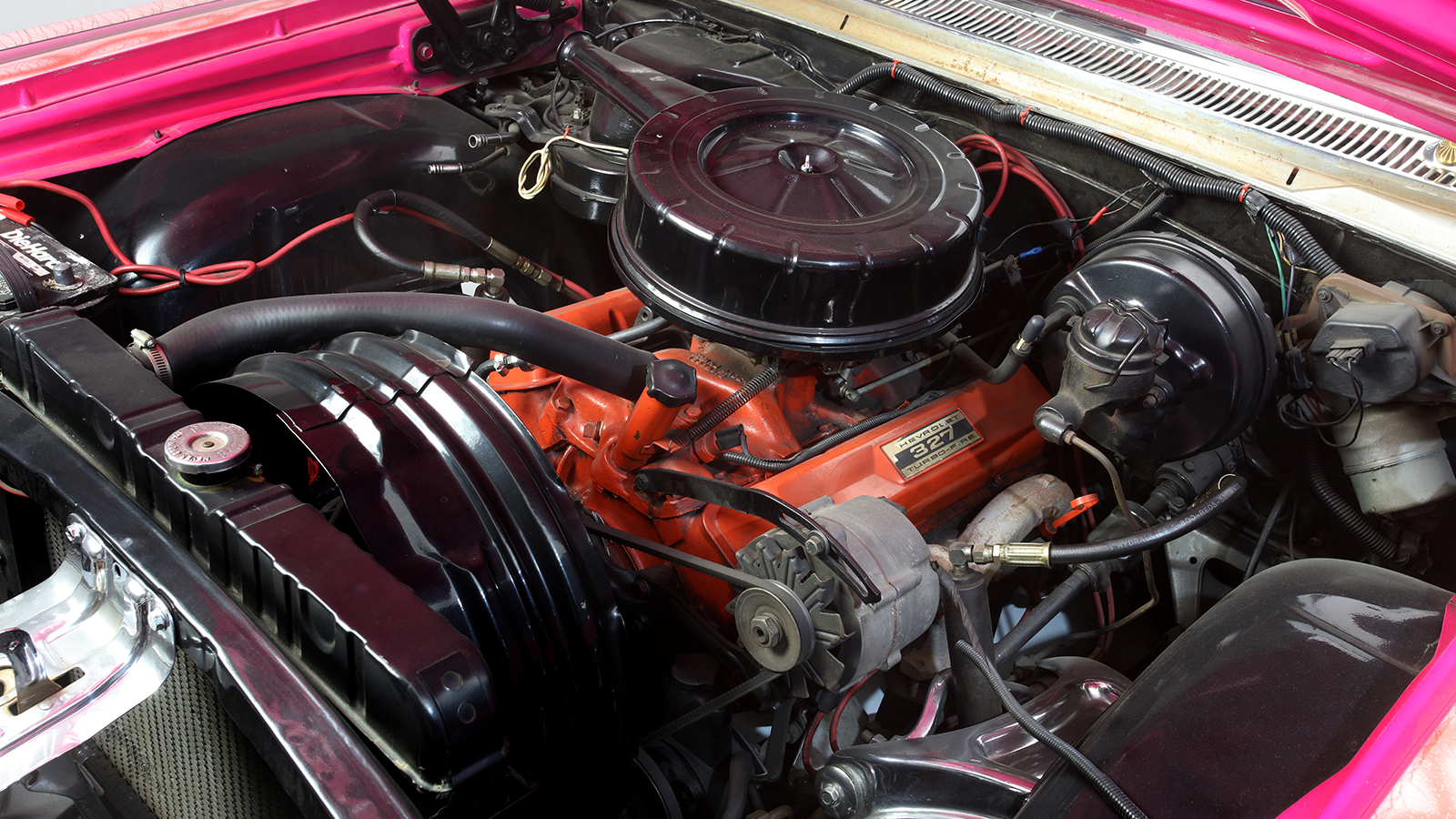 The body was unmodified from standard, as were the 327cu in Turbo-Fire V8 and Powerglide transmission, while the bank of batteries and powerful hydraulic compressors – to raise and lower each corner of the car independently – were added in later years.