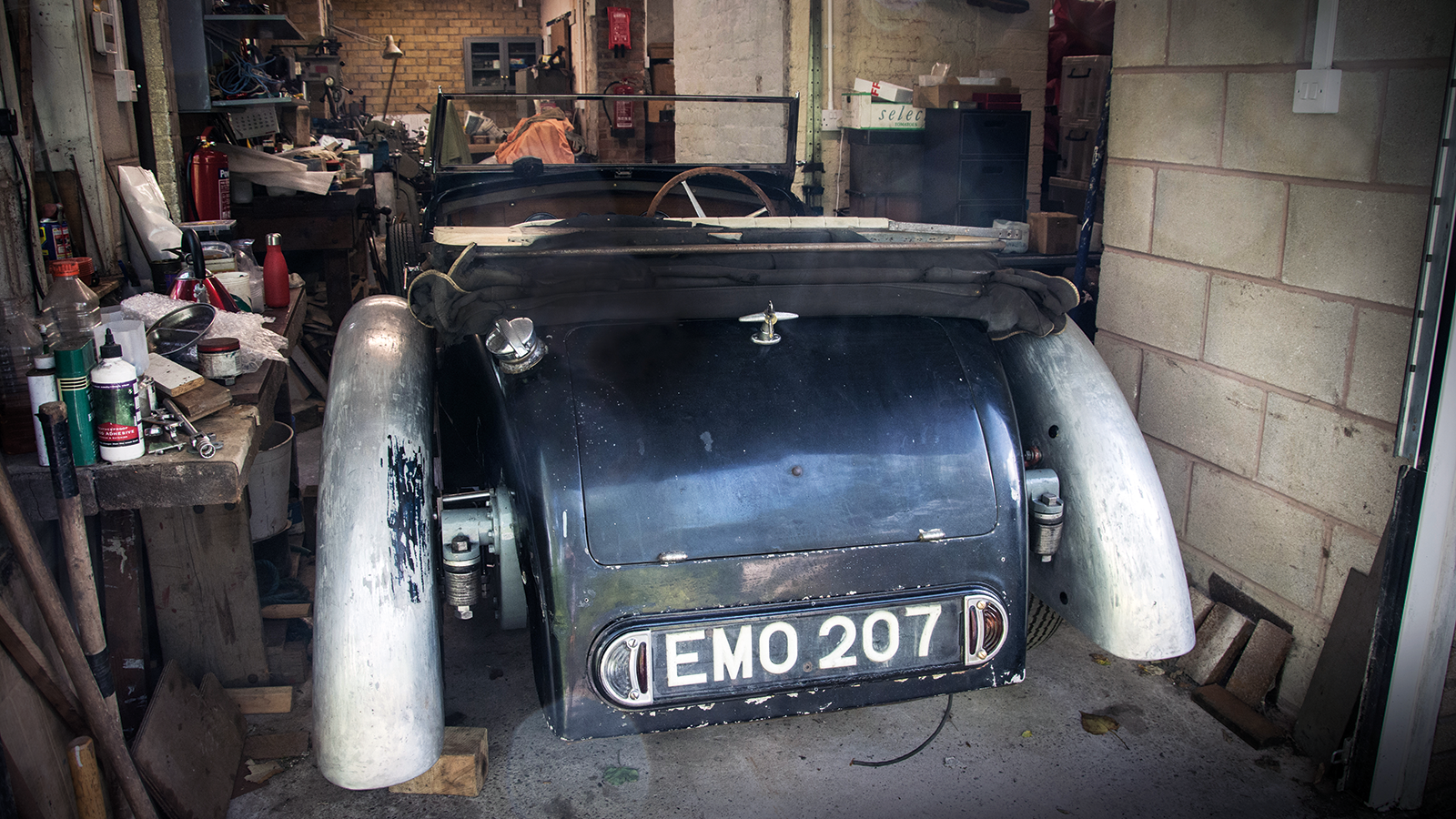 Squeezing down the garage along the grubby black tourer, the long, low bonnet and magnificent vee-shaped radiator become clear among the boxes, parts and panels.