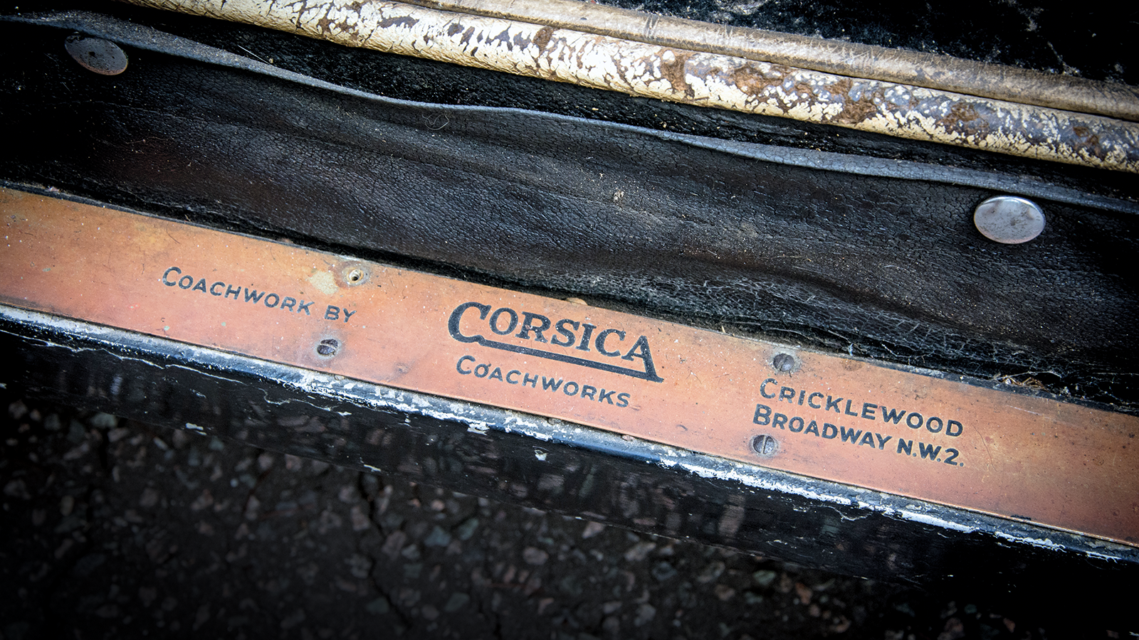 Inside the cutaway door is the scuffed body plate of Corsica Coachworks, Cricklewood NW2, from whom the wealthy heir to the family shipping business had commissioned a sleek tourer-style body and instructed the family insignia be painted on the side.