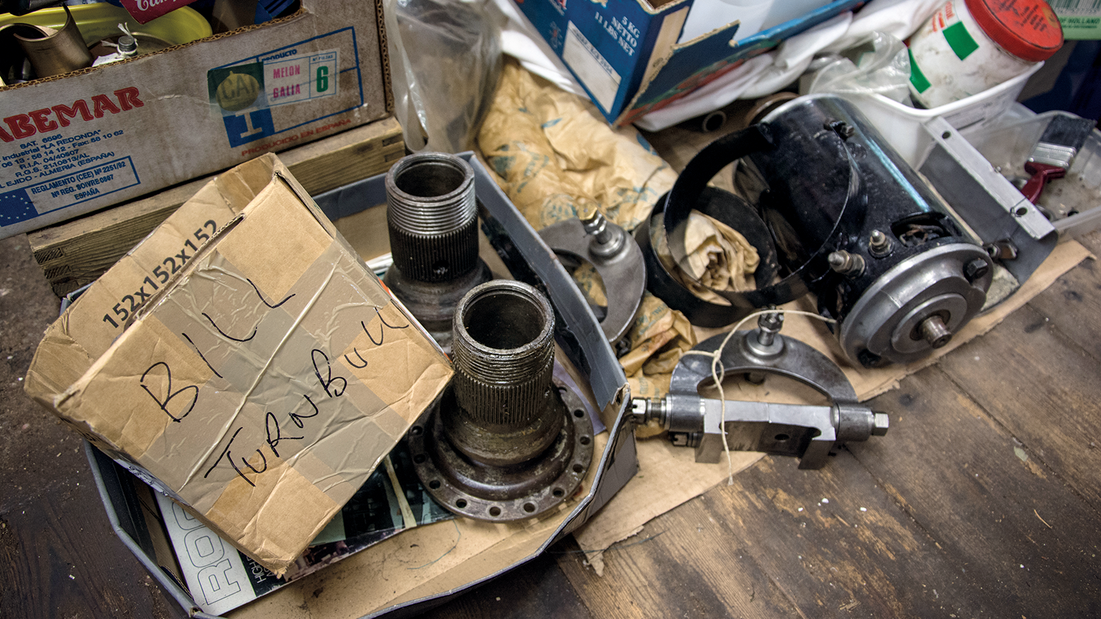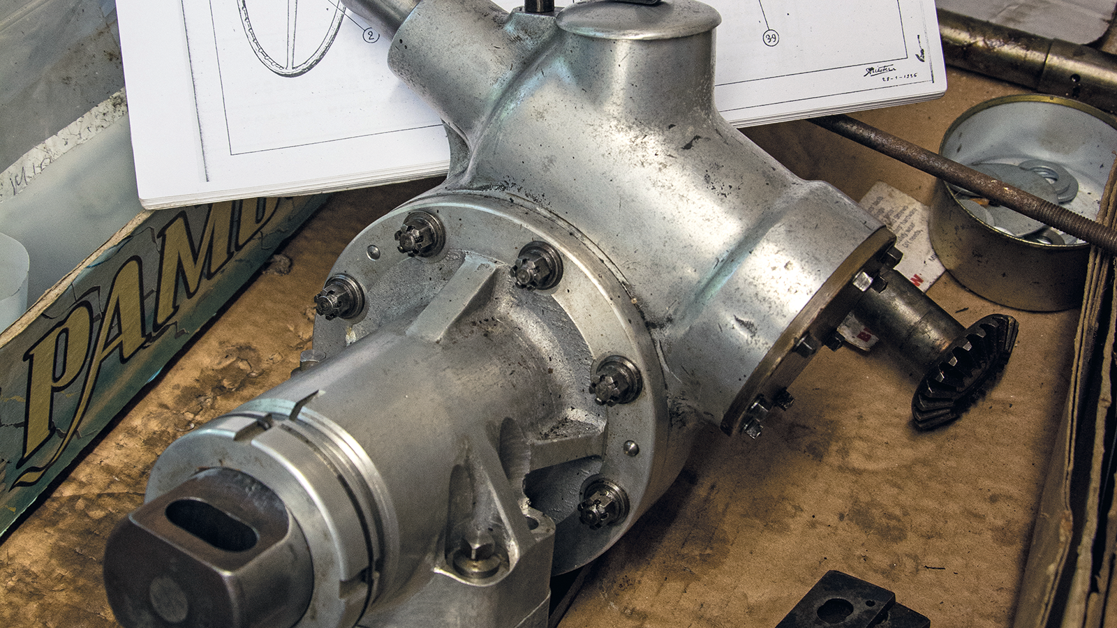 Beautifully made parts are wrapped in brown greaseproof paper, while a French parts book, factory drawings and notebooks are propped among cans of files and boxes of carefully labelled nuts and bolts.