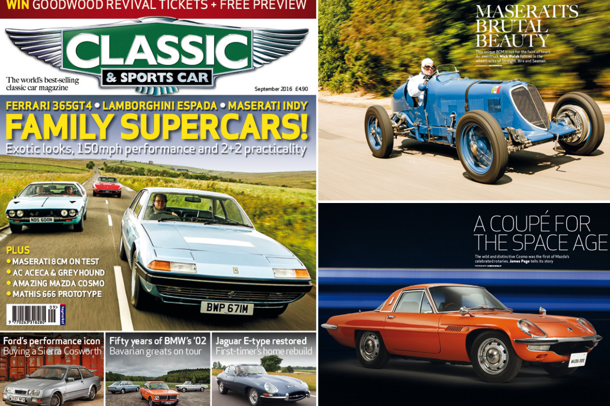 The brand-new issue of Classic & Sports Car hits the shelves in the UK today (4 August), and it’s packed to the rafters with incredible classics, from four-door family supercars to Prince Bira’s Maserati 8CM. The outrageous Mazda Cosmo gets the full studio treatment, while AC’s Greyhound is pitted against Aceca. Fifty years of the BMW ’02 is celebrated in style, a Jaguar E-type is rebuilt from the ground up and Ford’s Sierra Cosworth is the subject of an in-depth buyer’s guide.